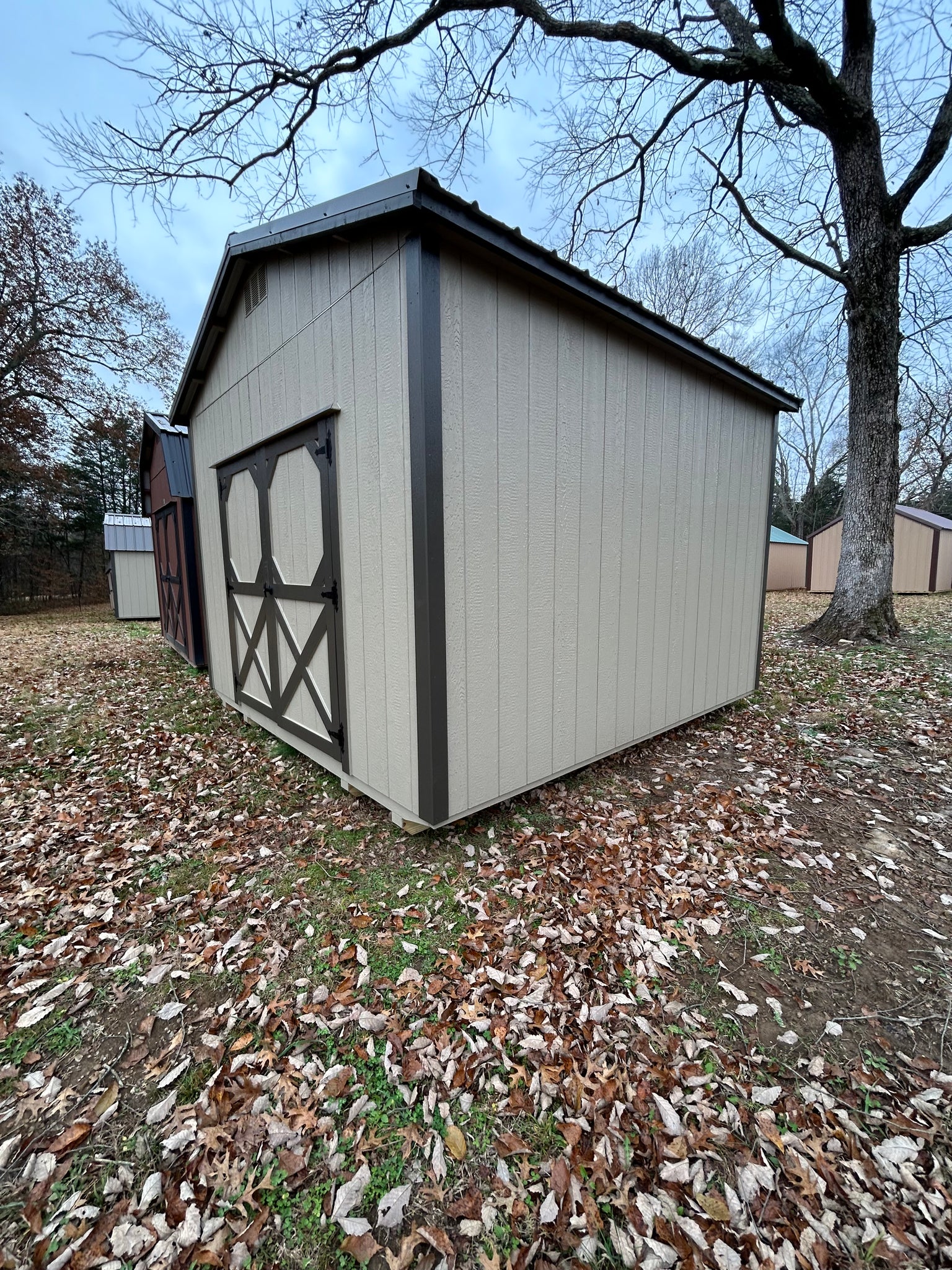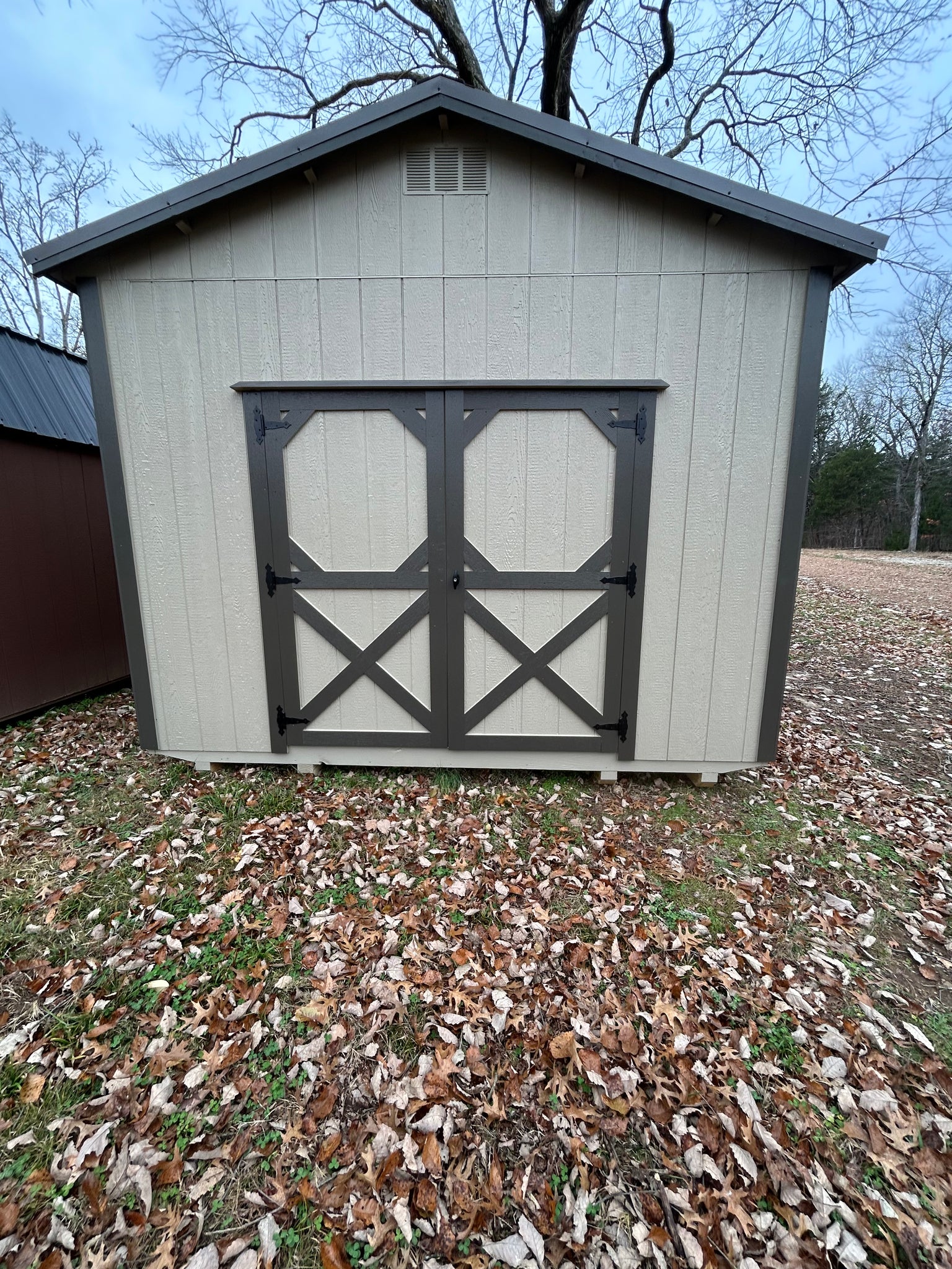 12x12 Tan Utility Shed is available for delivery!